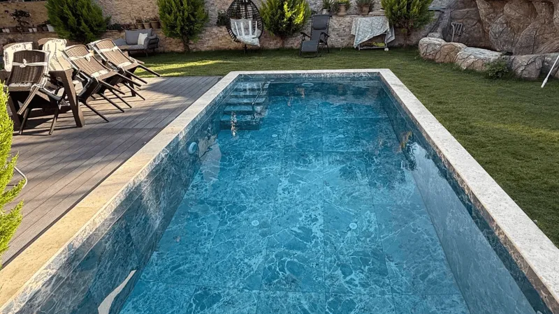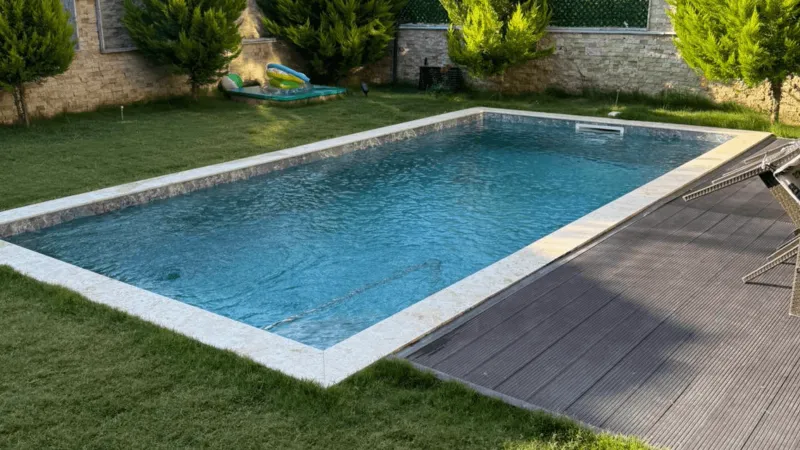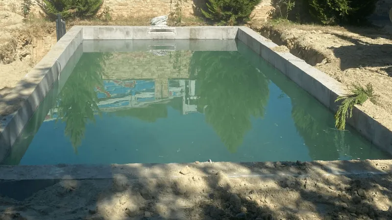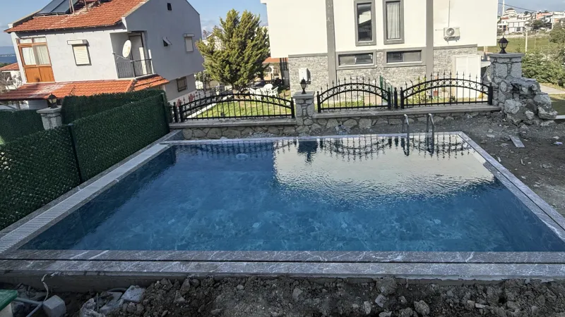 İzmir'in Seferihisar ilçesinde gerçekleştirdiğimiz 5x3 boyutlarındaki Skimmer Sistemli betonarme havuzumuz.